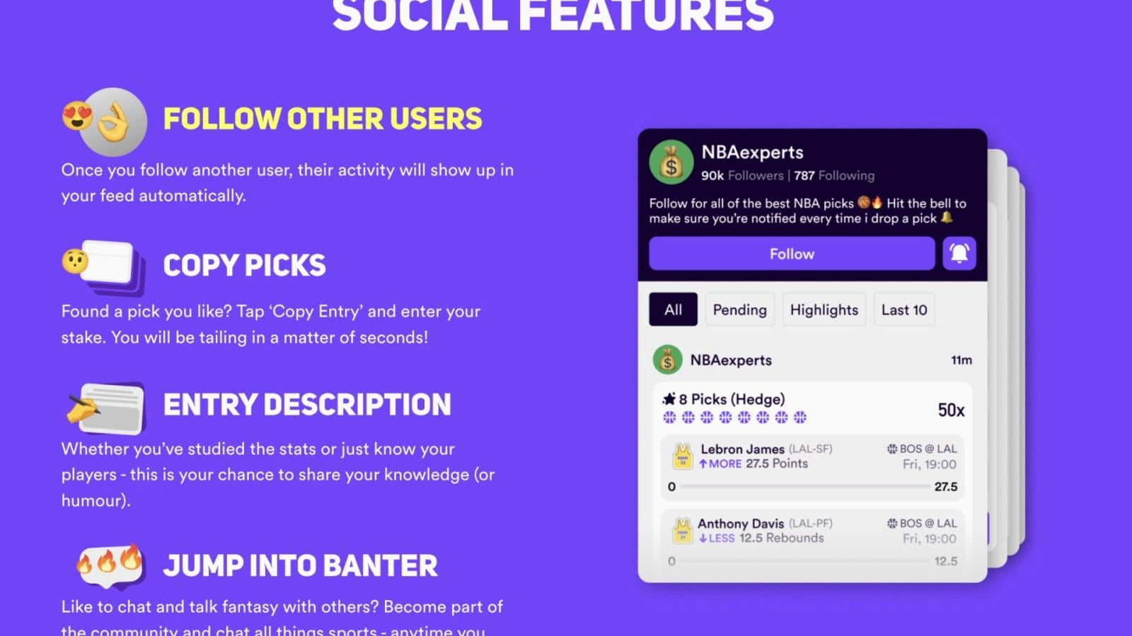You can follow other users, see their picks, and copy their picks with one click if you think they’re onto something good.