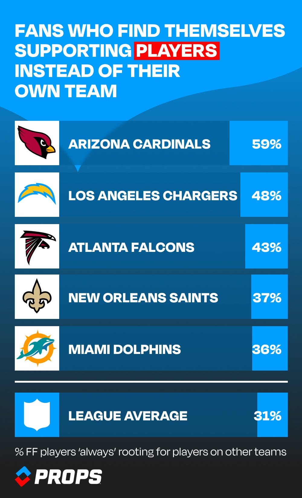 When it comes to this level of dedication, the most affected fantasy NFL fanbases are the Arizona Cardinals (53%), Los Angeles Chargers (48%), Atlanta Falcons (43%), New Orleans Saints (37%) and Miami Dolphins (36%).