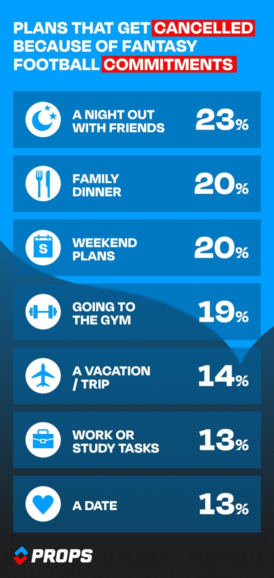 And the commitment doesn’t end there, as players are willing to delay or even cancel all kinds of plans because of fantasy football. A night out with friends suffers the most, as 23% of players will delay or cancel in favor of fantasy NFL. A family dinner (20%) and weekend plans (20%) are also commonly sacrificed, and 8% of players will even postpone or call off a date!