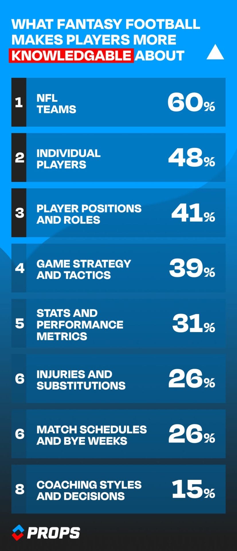 This isn’t surprising, though, as 60% of players say that fantasy football has made them more knowledgeable of NFL teams. In addition, 48% say it has helped them find out more about individual players, and 41% better understand player positions and roles due to fantasy NFL.