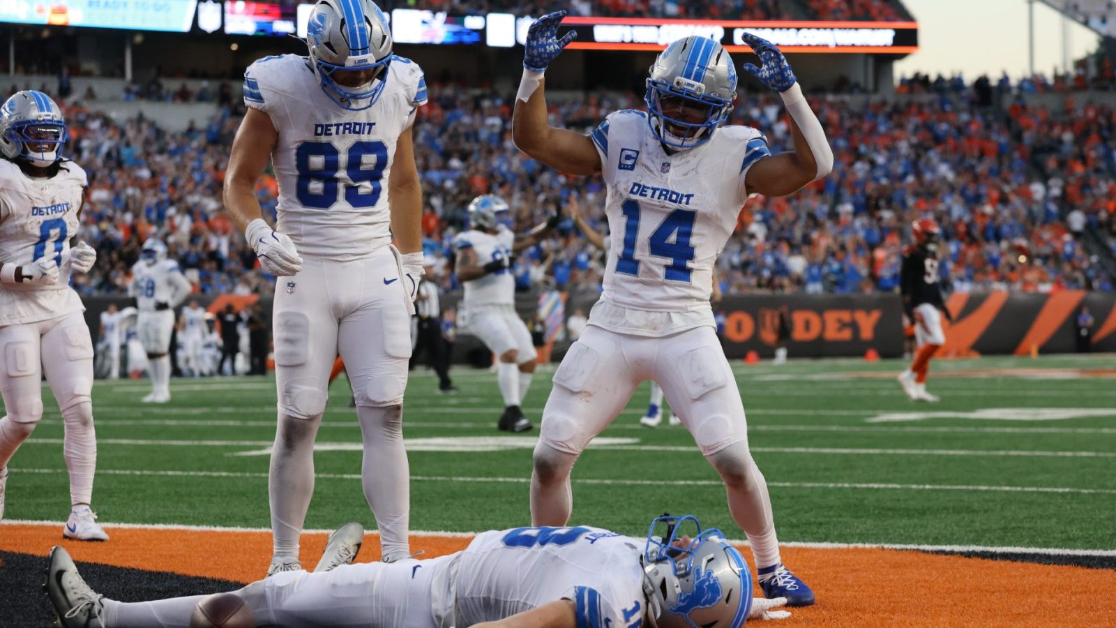 Jared Goff has two main targets with Sam LaPorta injured. Amon-Ra St. Brown and Gibbs each have 27% or better target shares in two games without their star tight end. Jameson Williams is always a big-play threat, while Brock Wright is getting the tight end snaps