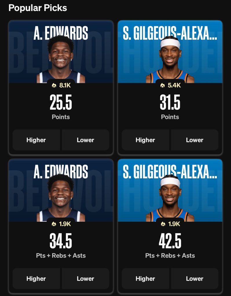 The three most popular plays for Wednesday’s matchup are Anthony Edwards, Shai Gilgeous-Alexander, and Chet Holmgren. Edwards and Gilgeous-Alexander are both having typically stellar seasons, while Holmgren has played his usual complementary role and is averaging a career-best 18.3 points per game despite some fluctuations in his production.